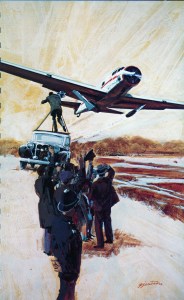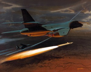 Roy retired in 1992. A large number of Roy’s works were donated to the San Diego Air & Space Museum when General Dynamics shuttered the San Diego division in 1993, including these two particularly ominous paintings of the Rockwell B-1 Lancer.