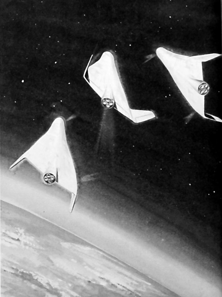 In 1954 Goodyear Aerospace’s Darrell Romick and two colleagues introduced a concept model of a three-stage spaceplane, the third stage achieving earth orbit, at the annual conference of the American Rocket Society. Each stage would contain landing gear and a crew of its own, allowing each to be piloted to landing for reuse. Launched at White Sands, the first booster stage would separate 300 miles downrange at an altitude of 24 miles, the second stage 700 miles farther at 41 miles, with the third stage continuing to orbit.