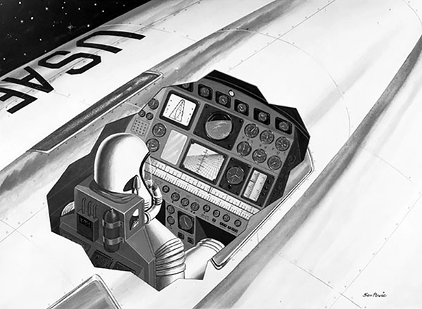 Left: After aerobraking in the atmosphere, the opaque heatshield protecting the window is jettisoned so the pilot can see the fucking ground. Right: Bell Aircraft artist concept.