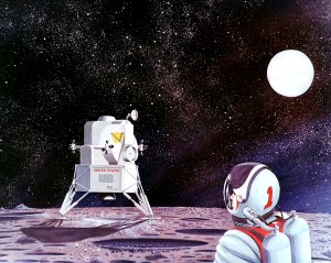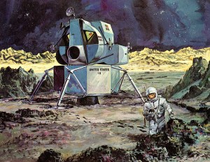 From Drew Granston‘s collection: a beautiful early rendering of Grumman’s LM by Craig Kavafes.