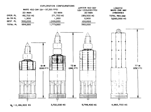 Fig. 3.12 — Various payload configurations on basic 10-m propulsion module (with departure weights for 72, 850 fps Mars mission)