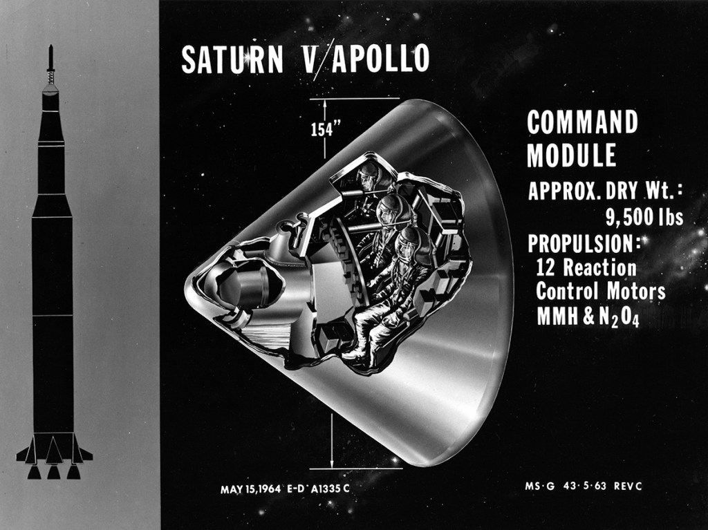 The Saturn V configuration is shown in inches and meters as illustrated by the Boeing Company. The Saturn V vehicle consisted of three stages: the S-IC (first) stage powered by five F-1 engines, the S-II (second) stage powered by five J-2 engines, the S-IVB (third) stage powered by one J-2 engine. A top for the first three stages was designed to contain the instrument unit, the guidance system, the Apollo spacecraft, and the escape system. The Apollo spacecraft consisted of the lunar module, the service module, and the command module. The Saturn V was designed perform lunar and planetary missions and it was capable of placing 280,000 pounds into Earth orbit.