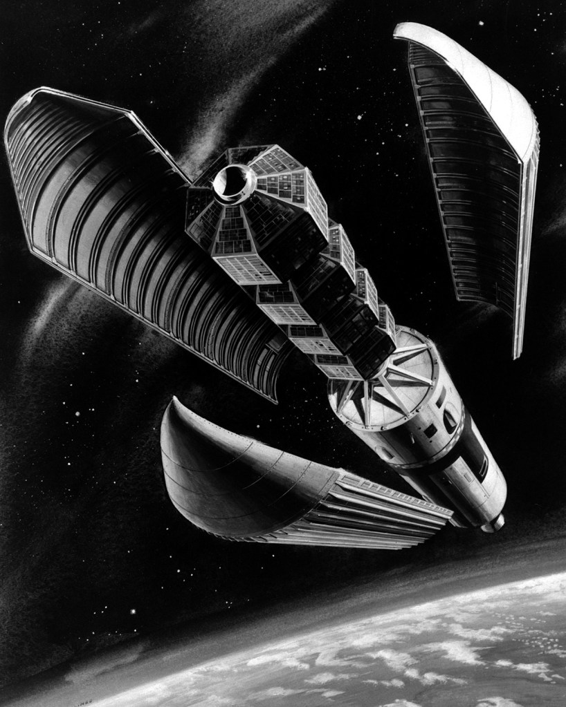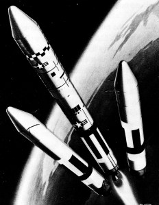 The MOL – Manned Orbiting Laboratory – is shown, in this artist’s view, being lifted into space by the Titan III C. On top of the cylindrical canister, the crew sit in a modified Gemini capsule.