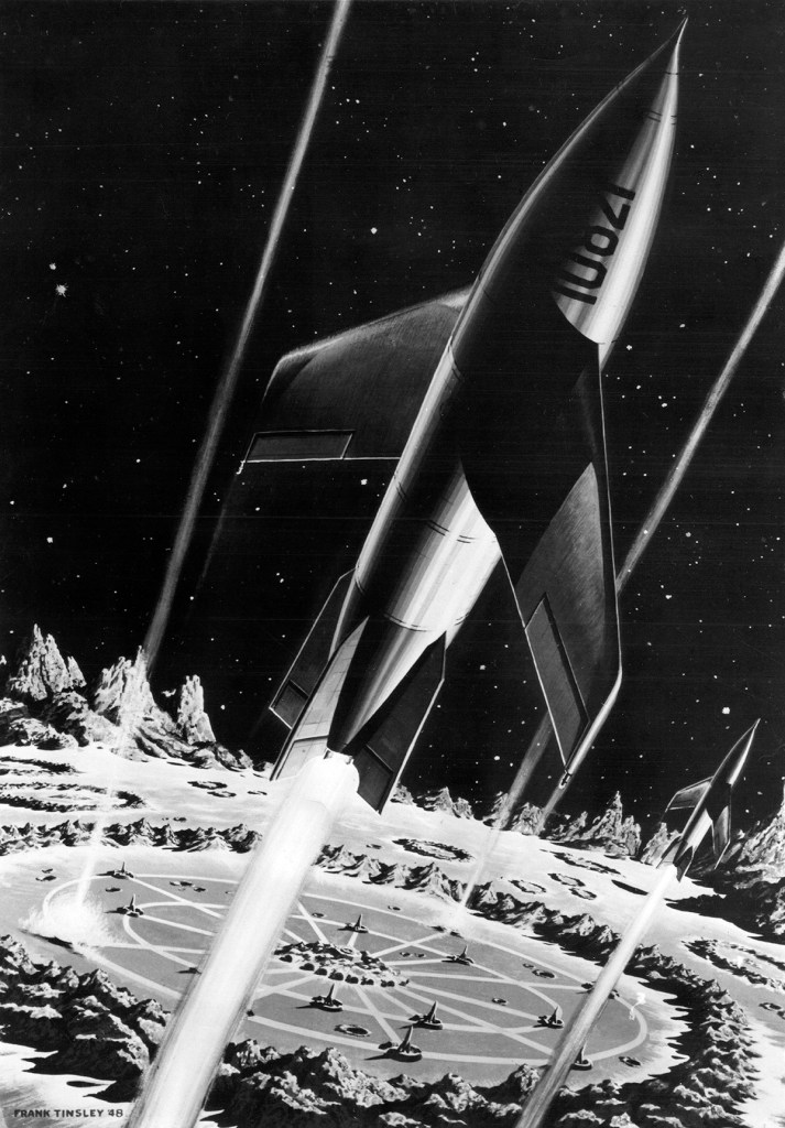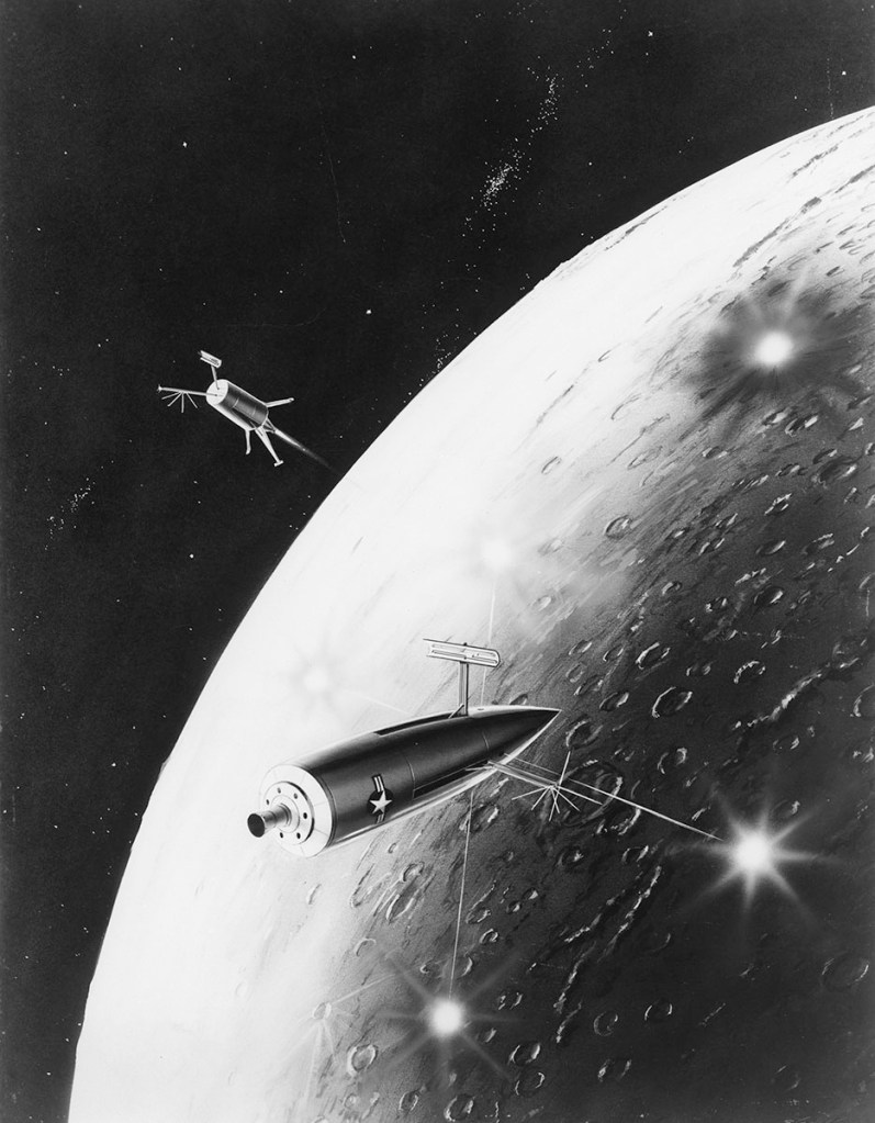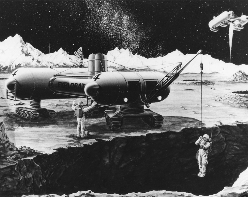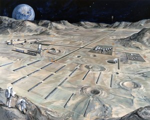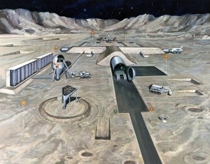 ARTIST’S CONCEPTION OF A SCIENTIFIC BASE ON THE MOON AND A DIFFUSE NEBULA IN THE CONSTELLATION CASSIOPEIA