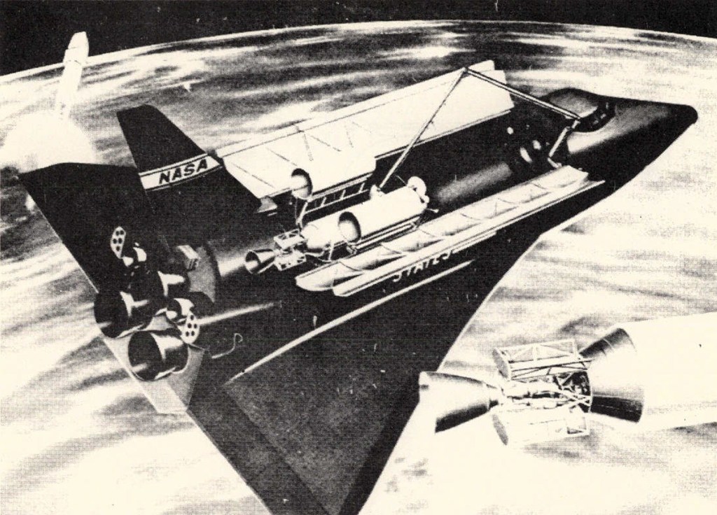 Artist’s concept of the pre-Shuttle Lockheed-sponsored Star Clipper stage-and-one-half lifting body configuration ascending from a desert launching base – circa 1968.