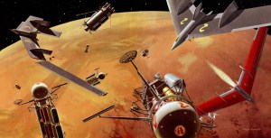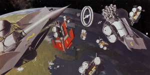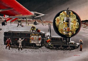 - Advance party, after landing on Martian snow in ski-equipped plane, prepares for trip to equator. Men live in inflatable, pressurized spheres mounted on tractors, enter and leave through air locks in the central column. Sphere on tractor is just being blown up. Cutaway of tractor, foreground, shows closed-circuit engine, run by hydrogen peroxide, oil. Trailer cutaway shows fuel supply, cargo.