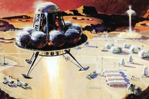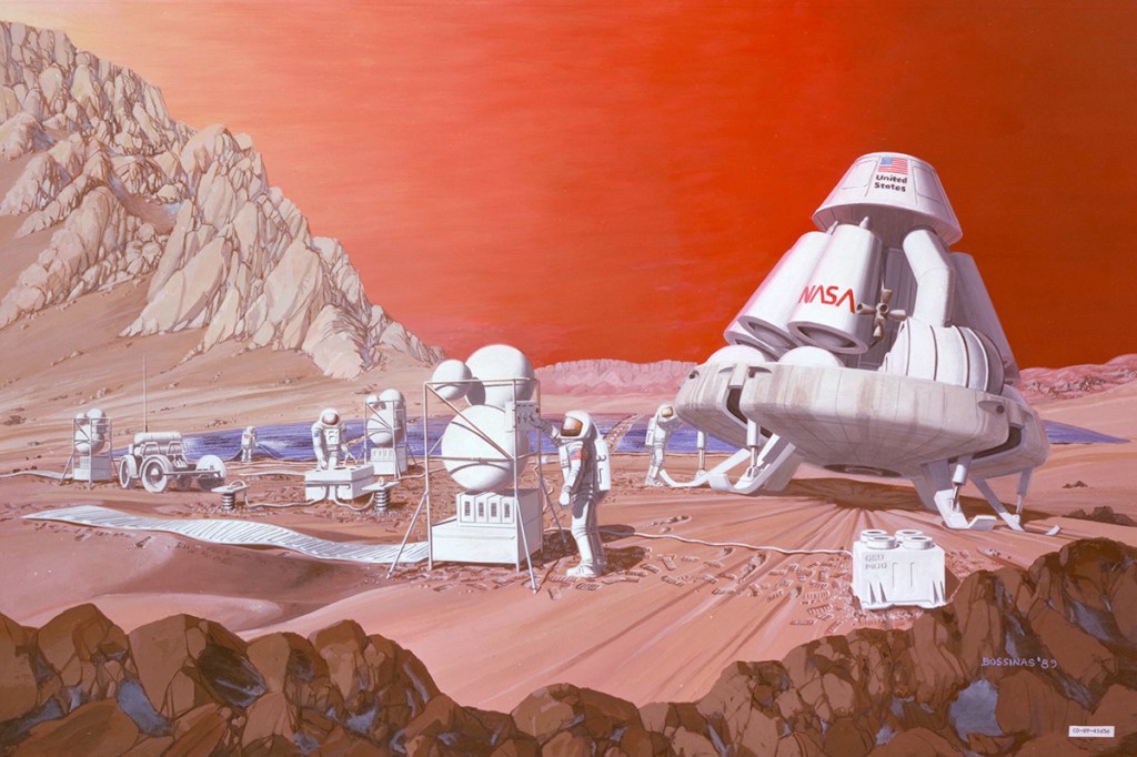 First manned landing on Mars! This Northrop sketch shows how a soft landing on the red planet might look from ground level. A steerable gliding cloverleaf parachute slows the craft down as the retrorockets start to fire. The parachute is then jettisoned, and the retrorockets perform the final maneuver for touchdown. Retrorocket braking was perfected in the 1960’s to provide the soft landings for the Surveyor moon probe.