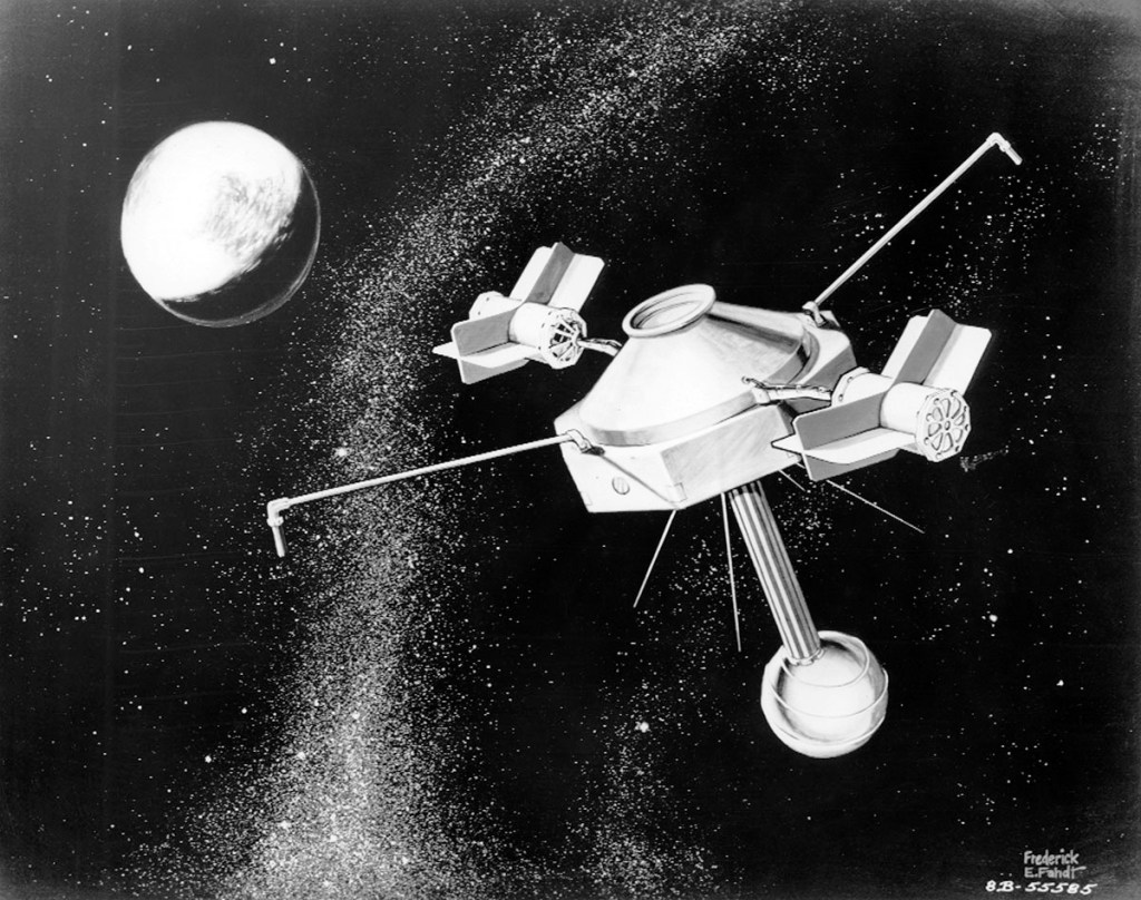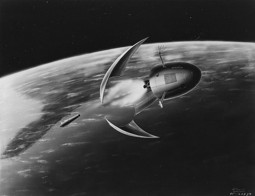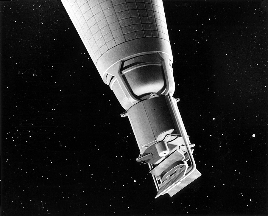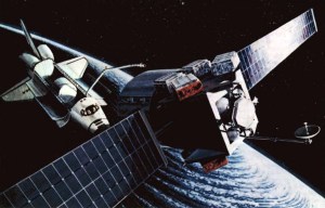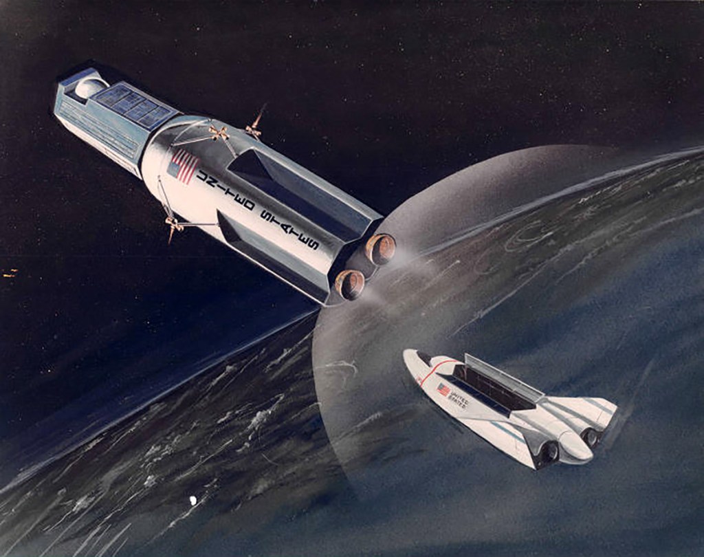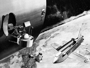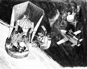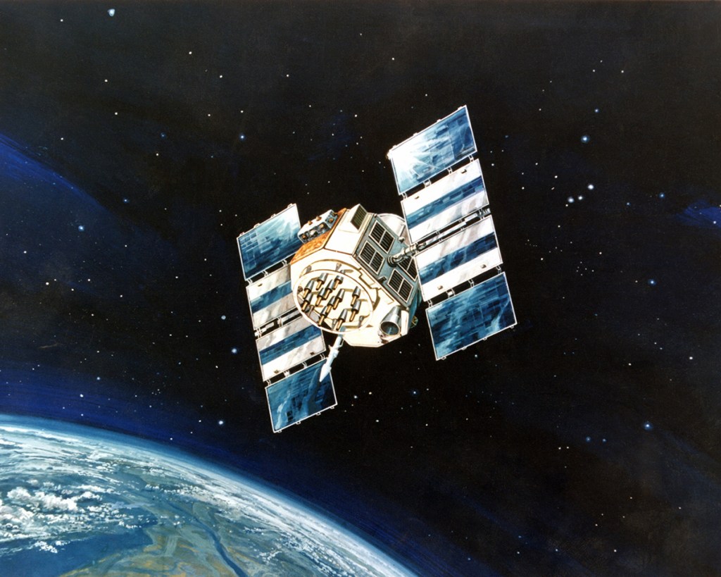 STS-26 Discovery, Orbiter Vehicle (OV) 103, artwork depicts tracking and data relay satellite C (TDRS-C) deployment. OV-103 orbits above Earth in bottom-to-sun attitude, moments after TDRS-C’s release into space. TDRS-C is seen just below open payload bay (PLB). Artwork was done by Pat Rawlings of Eagle Engineering.