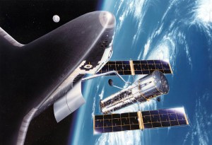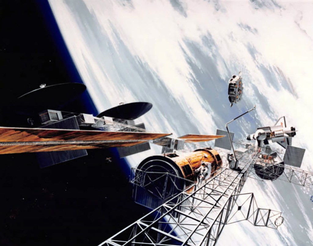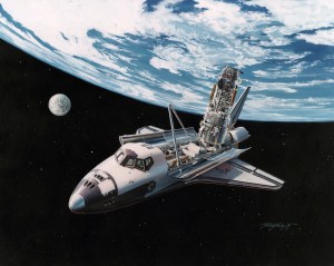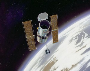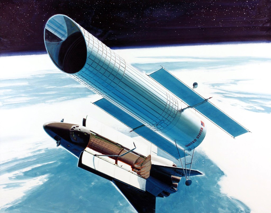 This artist concept shows the Hubble Space Telescope (HST) in operational configuration orbiting the Earth after its deployment from Discovery, Orbiter Vehicle (OV) 103 during STS-31. The high gain antennas (HGAs) and solar arrays (SAs) have been extended. HST’s aperture door is open as it views the universe from a vantage point above the Earth’s atmosphere. View provided by the Marshall Space Flight Center (MSFC).