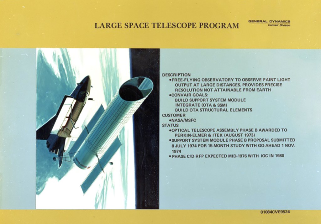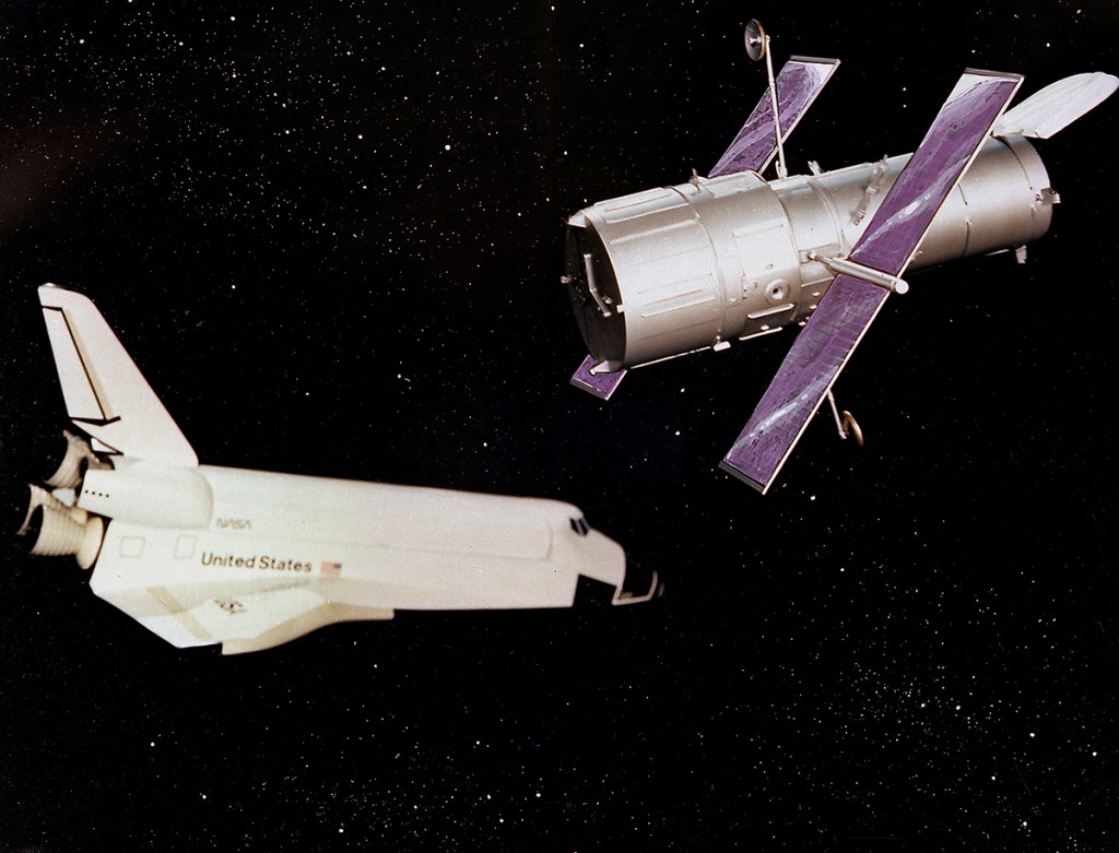 This is an artist’s concept of the Hubble Space Telescope (HST). The HST is the product of a partnership between NASA, European Space Agency Contractors, and the international community of astronomers. It is named after Edwin P. Hubble, an American Astronomer who discovered the expanding nature of the universe and was the first to realize the true nature of galaxies. The purpose of the HST, the most complex and sensitive optical telescope ever made, is to study the cosmos from a low-Earth orbit. By placing the telescope in space, astronomers are able to collect data that is free of the Earth’s atmosphere. The HST detects objects 25 times fainter than the dimmest objects seen from Earth and provides astronomers with an observable universe 250 times larger than is visible from ground-based telescopes, perhaps as far away as 14 billion light-years. The HST views galaxies, stars, planets, comets, possibly other solar systems, and even unusual phenomena such as quasars, with 10 times the clarity of ground-based telescopes. The major elements of the HST are the Optical Telescope Assembly (OTA), the Support System Module (SSM), and the Scientific Instruments (SI). The HST is approximately the size of a railroad car, with two cylinders joined together and wrapped in a silvery reflective heat shield blanket. Wing-like solar arrays extend horizontally from each side of these cylinders, and dish-shaped anternas extend above and below the body of the telescope. The HST was deployed from the Space Shuttle Discovery (STS-31 mission) into Earth orbit in April 1990. The Marshall Space Flight Center had responsibility for design, development, and construction of the HST. The Perkin-Elmer Corporation, in Danbury, Connecticut, developed the optical system and guidance sensors. The Lockheed Missile and Space Company of Sunnyvale, California produced the protective outer shroud and spacecraft systems, and assembled and tested the finished telescope.