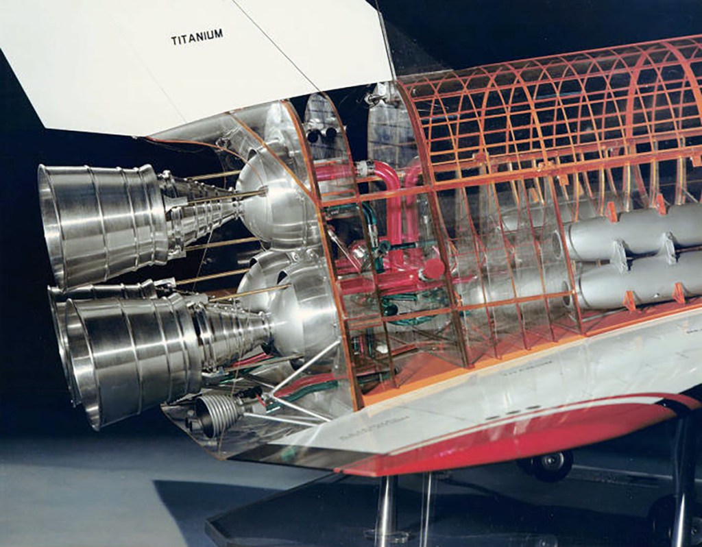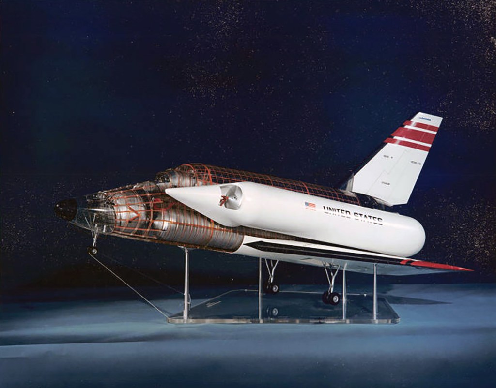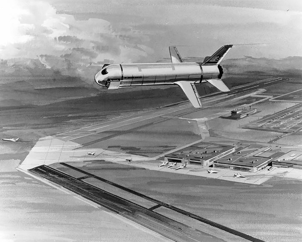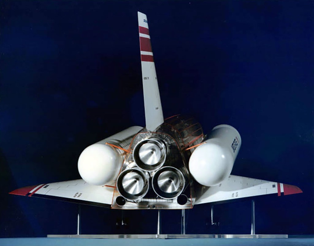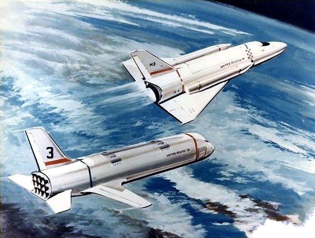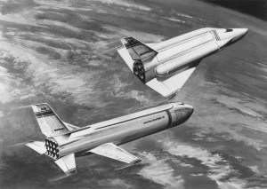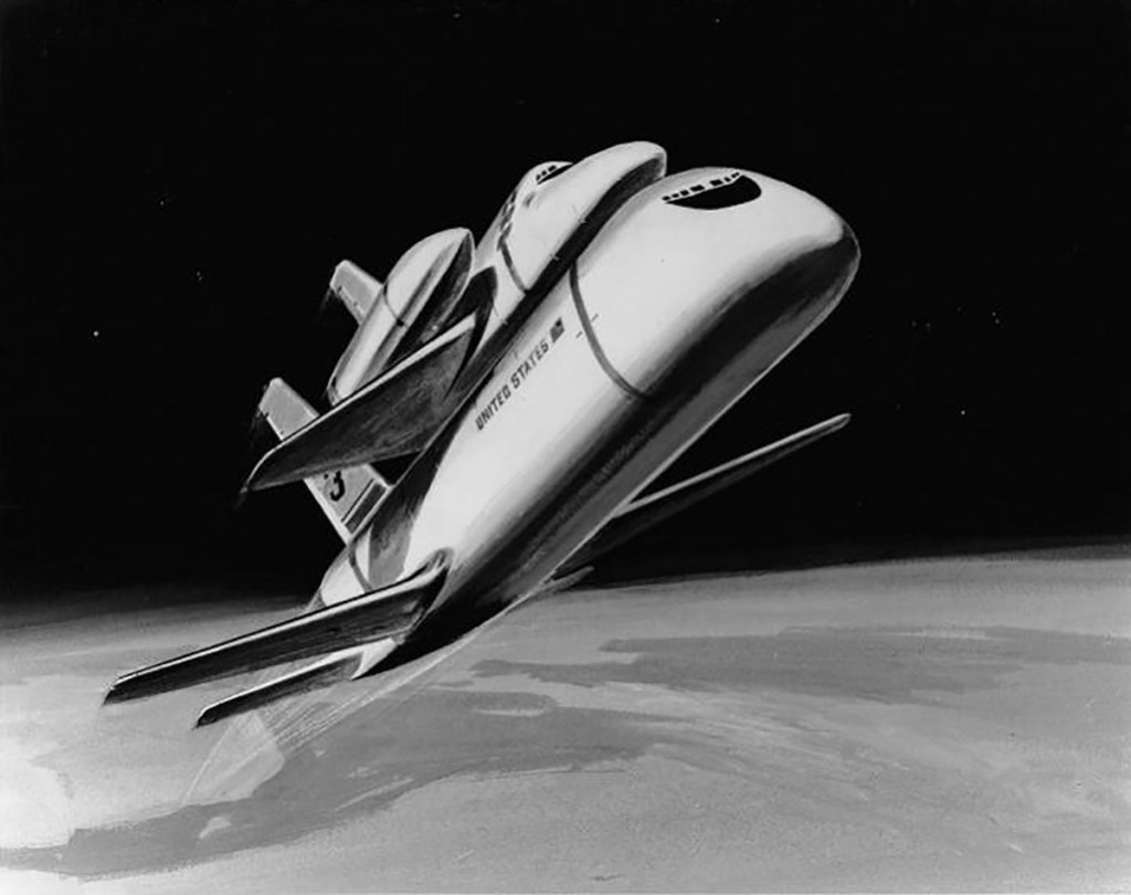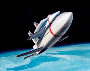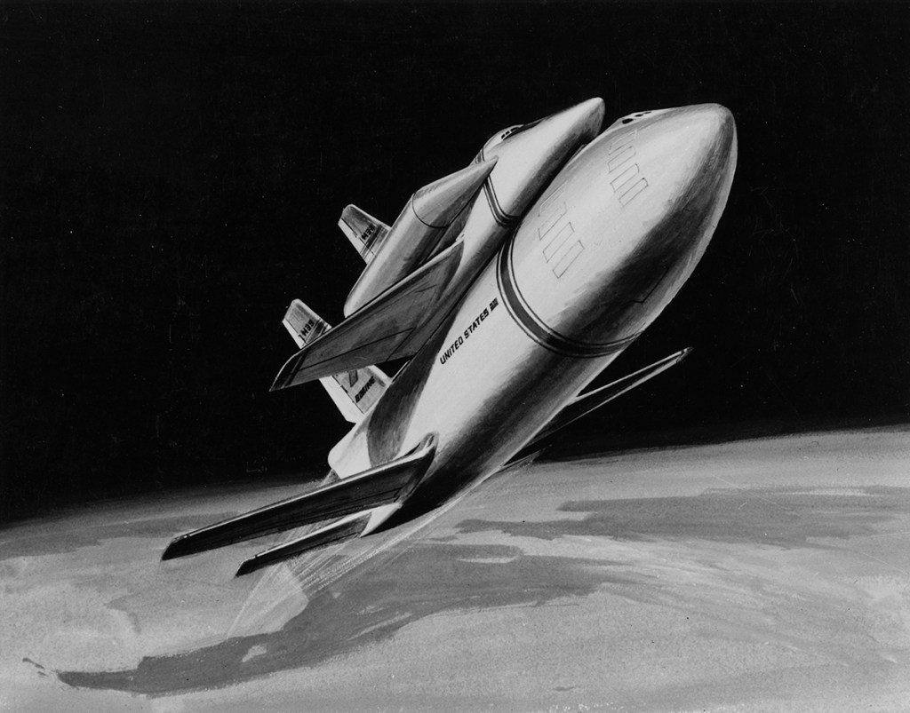Concept shows the Shuttle in flight, heading toward separation of the Booster and the Orbiter at about 40-mi. altitude.