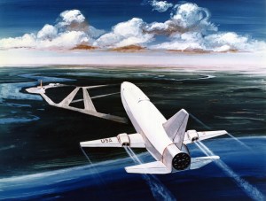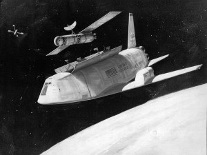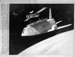 THE 6:10 INTO SPACE. NASA is working on the design of a winged shuttle craft to resupply the manned space stations of the next decade. The giant space transports shown here can carry 50,000 pounds of men and cargo to the cluster of cylinders that make up a space base, the return to Earth and land like airplanes.
