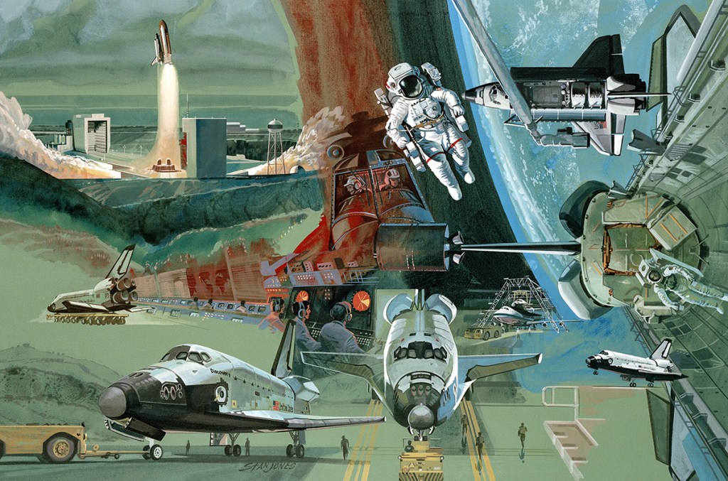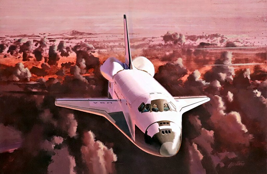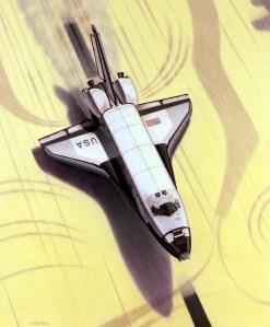 STS-26 Discovery, Orbiter Vehicle (OV) 103, artwork depicts tracking and data relay satellite C (TDRS-C) deployment. OV-103 orbits above Earth in bottom-to-sun attitude, moments after TDRS-C’s release into space. TDRS-C is seen just below open payload bay (PLB). Artwork was done by Pat Rawlings of Eagle Engineering.