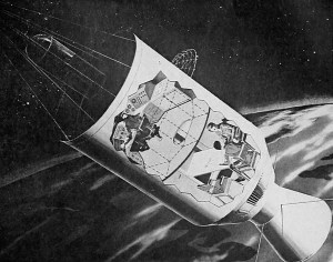 GENERAL DYNAMICS / ASTRONAUTICS artist’s conception of a three-man Manned Astronautical Research Station (MARS) in operation 200 miles above earth. The station in orbit would be linked to a spent Centaur vehicle. The two bodies would rotate about each other, the resulting centrifugal force providing the necessary artificial gravity.