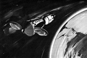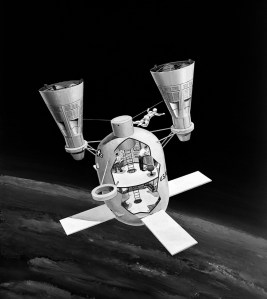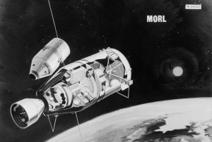 Medium-sized orbiting lab is this Manned Orbital Research Laboratory (MORL) developed for NASA’s Langley Lab by Douglas Missiles & Spacecraft Division. The lab which weighs about 35,000 pounds, could maintain 3 to 6 men in orbit for a year.