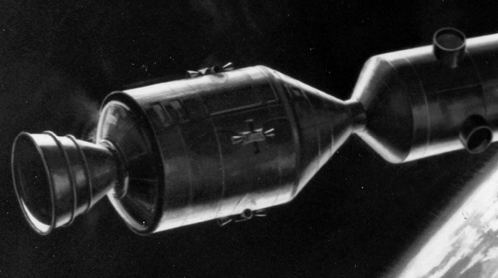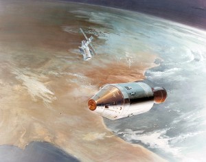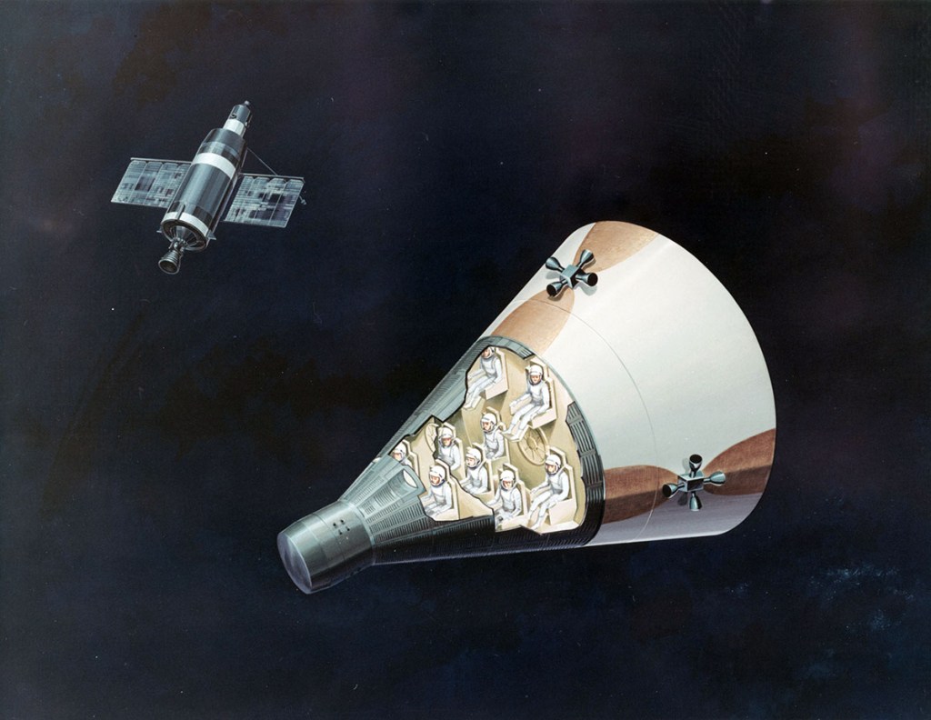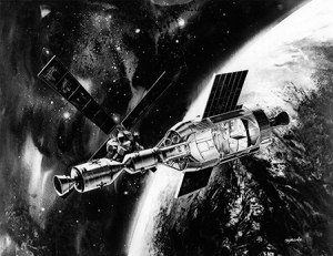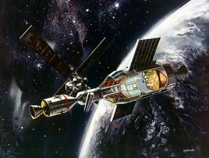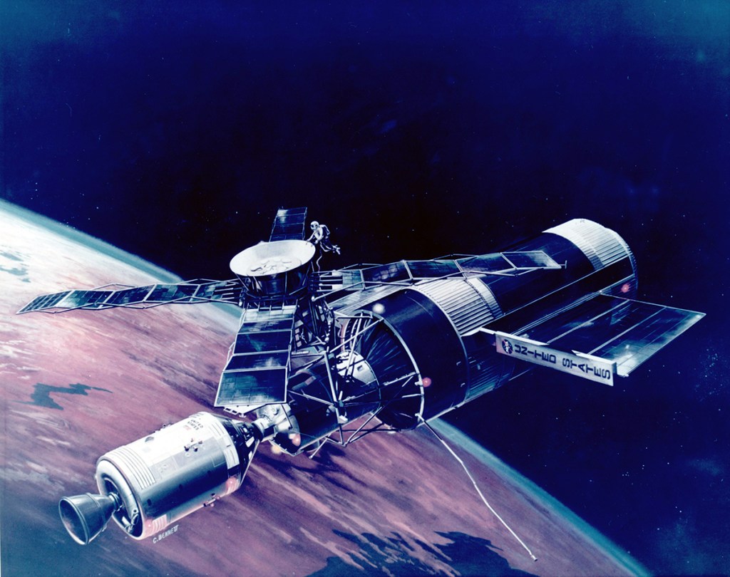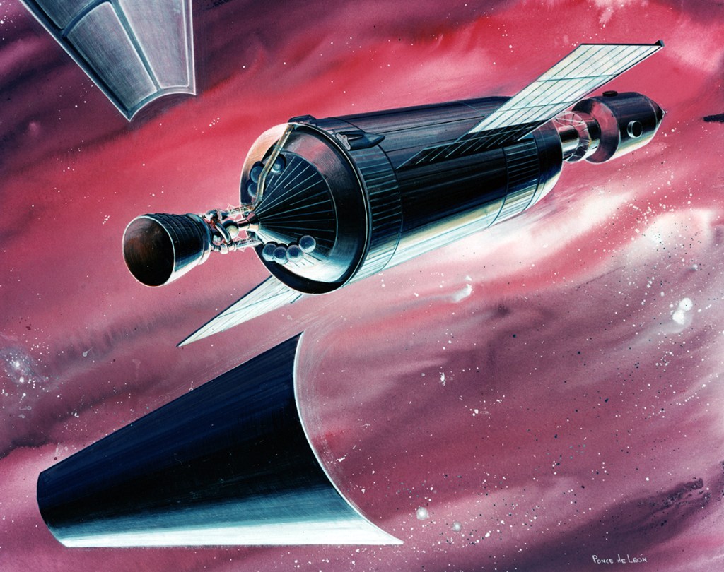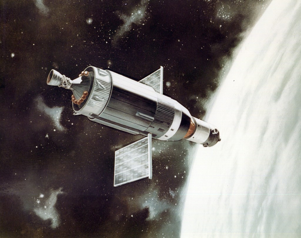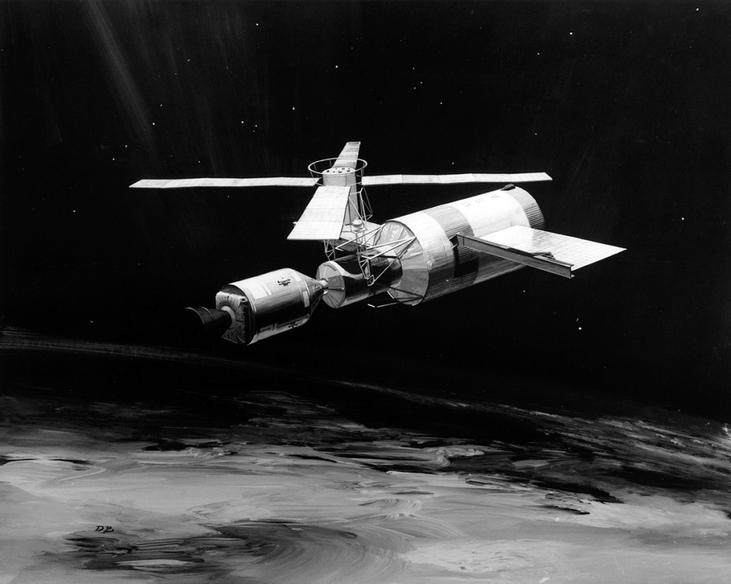 ORBITAL WORKSHOP — Artist’s concept showing how a Saturn S-IVB stage will appear when converted to the Apollo Applications Orbital Workshop. Launched fully fueled with airlock and docking adaptor attached, the S-IVB’s liquid hydrogen tank becomes a shirtsleeve environment workshop after the fuel has been depleted. At left is an Apollo Command and Service Module launched separately and docked into one of the docking adaptor’s ports. The Apollo Telescope Mount is shown docked into one of the side ports. The ATM will be joined to the cluster in a second phase of the program. Solar cell “wings” to provide power fold outward from the S-IVB after orbit is achieved. McDonnell Douglas Corporation’s Missile and Space Systems Division is making the S-IVB orbital workshop modifications under contract to NASA Marshall Space Flight Center and McDonnell Astronautics Company is developing the airlock under contract to MSC. (MCDONNELL DOUGLAS PHOTOGRAPH)