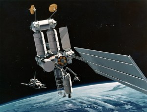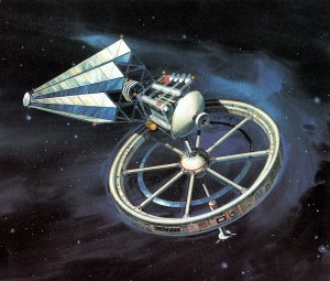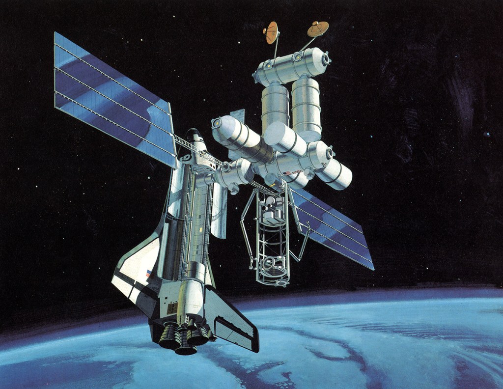 I’m pretty sure the top piece is by North American master illustrator M. Alvarez because he/she signed it. I think the bottom is by the same hand. What are we looking at? It’s a space station, but you knew that. You now know as much as I do. Parked here only because it shares the same page in Flying the Space Shuttles as the 1982 concept by Ted Brown I shared earlier.