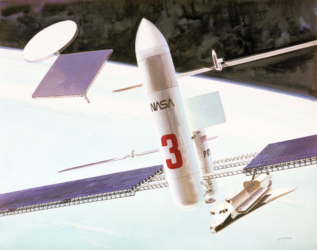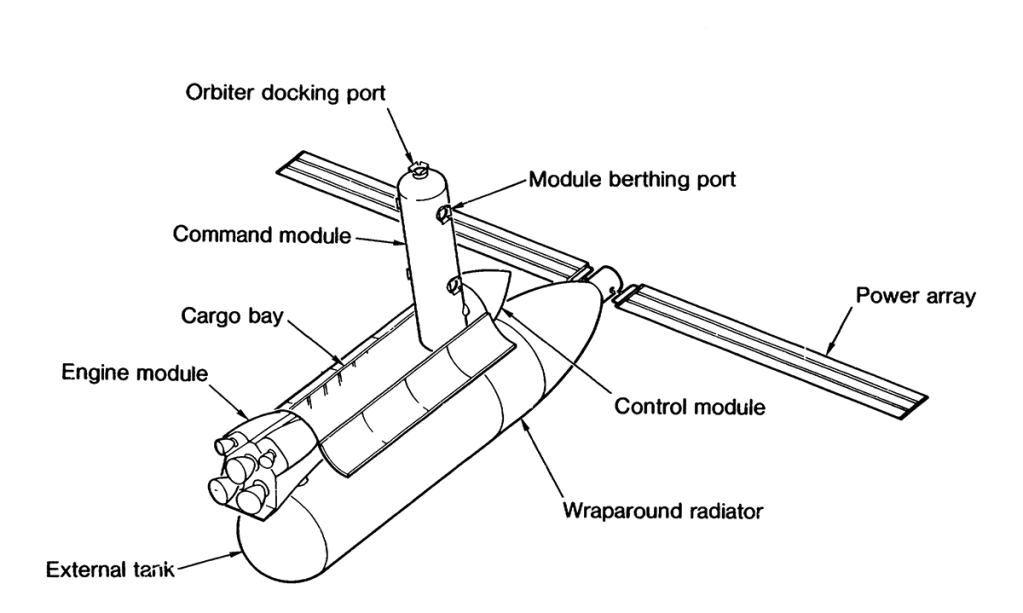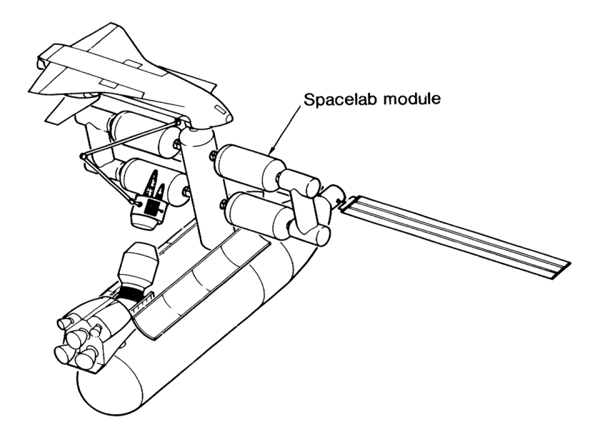 Once on orbit, the cargo bay doors are opened automatically and the platform command module is rotated 90° from its stowed position in the cargo bay to its operating position. With the command module in this position, an Orbiter cargo bay equivalent length remains available for accomodating spacecraft, etc., delivered by the Shuttle.