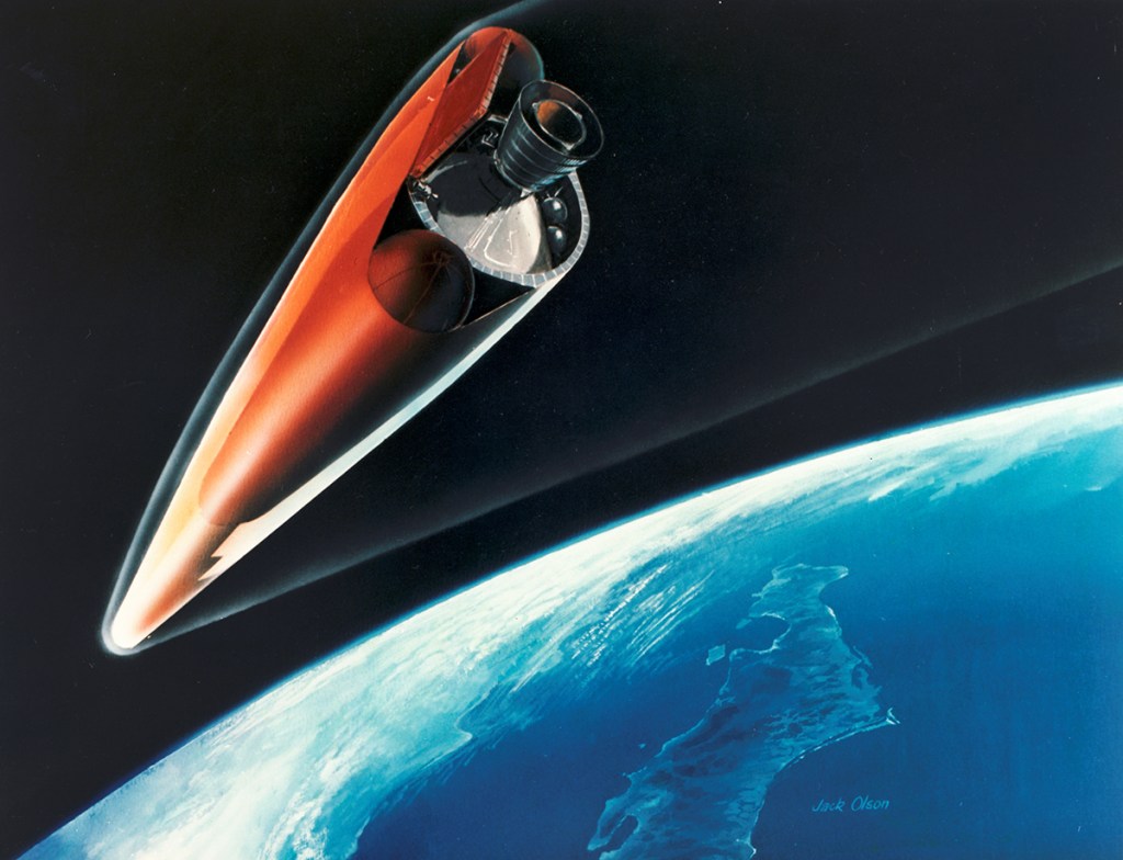 A hypersonic shockwave system envelopes an Aeroassisted Orbital Transfer Vehicle (AOTV) as it grazes the atmosphere before returning to the Space Shuttle in low Earth orbit. In this drawing, the main engine and the balloon-like parachute, or ballute, which encases the AOTV, provide protection from the reentry heat and drag to slow the vehicle as it enters a lower orbit. After reaching low Earth orbit, the ballute would be deflated and the AOTV would rendezvous with the Shuttle for reuse. This aerobraking technique is one of several being studied by Boeing Aerospace Company under contract to NASA’s Marshall Space Flight Center in Huntsville, Alabama.
