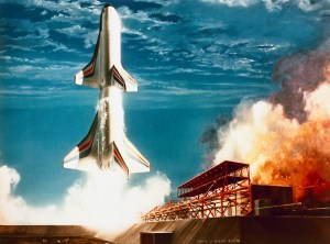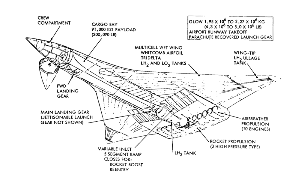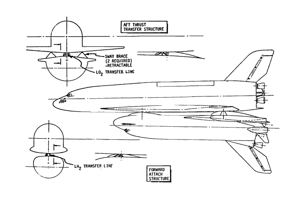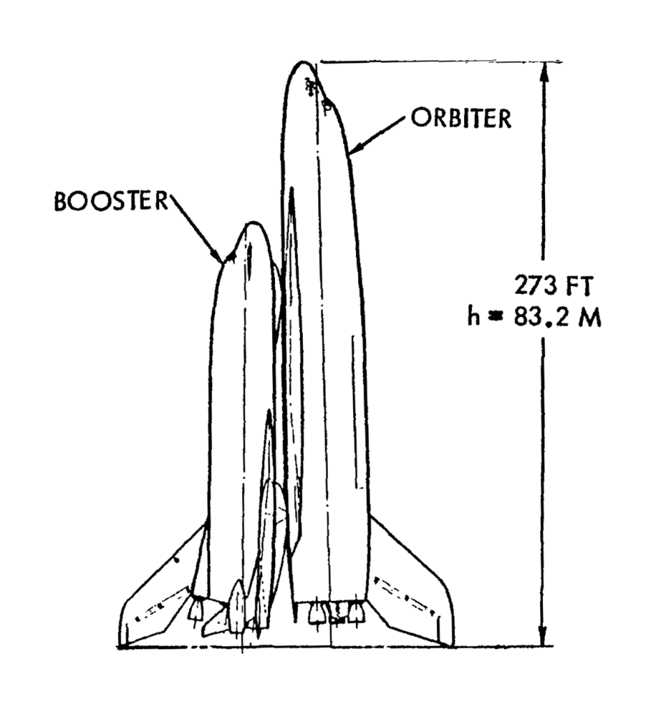 An alternate (smaller payload) configuration of more conservative design (i.e, more closely resembling the STS configuration) is depicted in the launch configuration, Figure 1.4-1. This configuration was adopted to permit the use of documented STS aerodynamic and performance data to address certain specific technical issues relative to VTO/HL vehicle concepts.