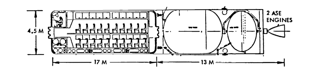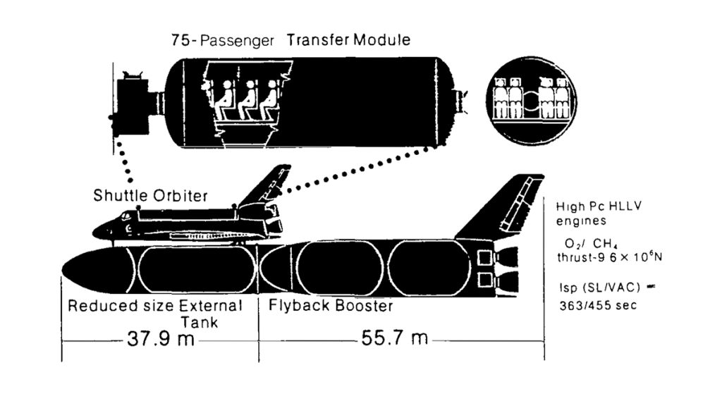 The PLV provides for the transportation of personnel and priority cargo between Earth and low orbit. The reference vehicle is derived from the current Space Shuttle system. It incorporates a winged fly-back booster instead of the solid rocket boosters and has a personnel compartment in the orbiter payload bay capable of transporting 75 passengers. The overall configuration and vehicle characteristics are shown in Figure 2. The passenger module is also shown in the figure.