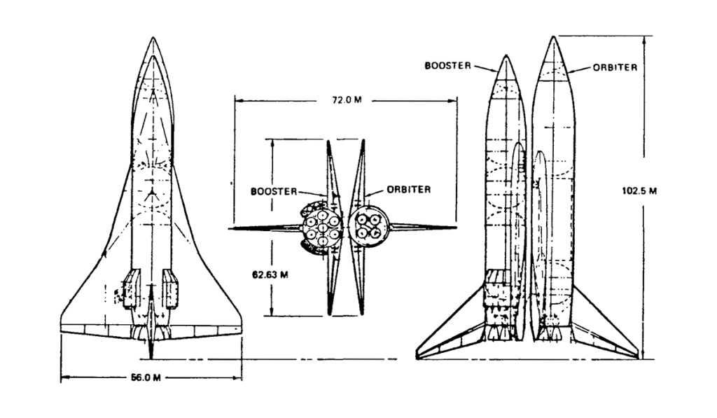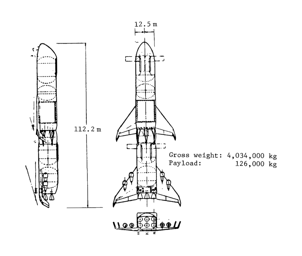 A PB/VTO/HL HLLV configuration is shown in Figure 1.2-1 in the launch. configuration. As shown, both stages have common body diameter, wing and vertical stabilizer; however, the overall length of the second stage (orbiter)is approximately 5 m greater than the first stage (booster). The vehicle gross lift off weight (GLOW) is 7.14 million kg with a payload capability of 230,000 kg to the referenced earth orbit.