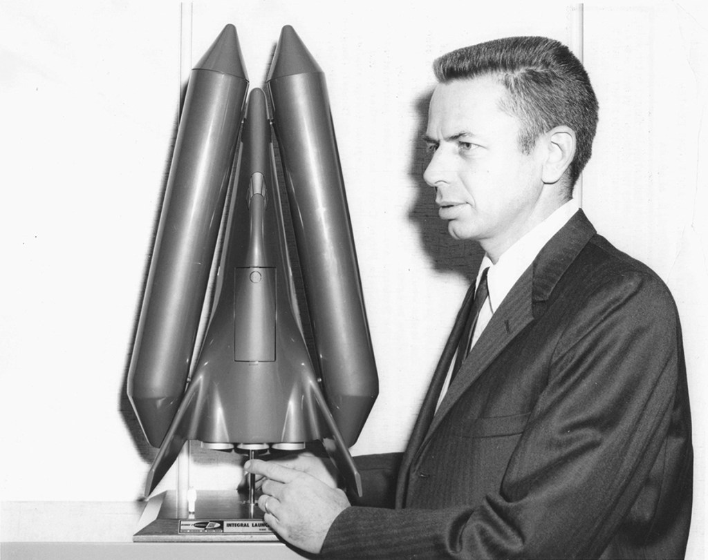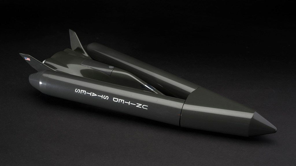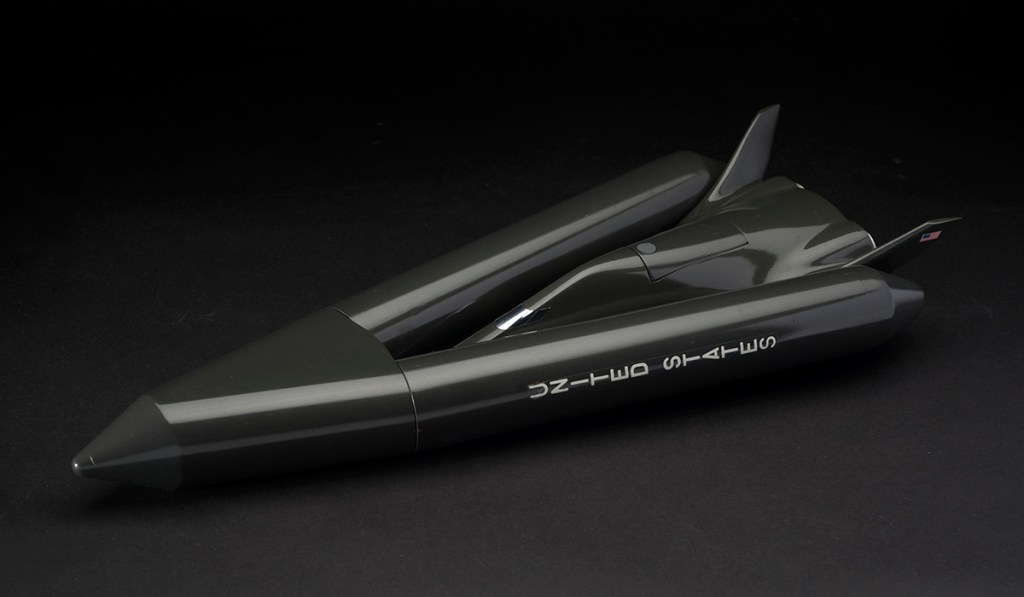 Artist’s concept of the pre-Shuttle Lockheed-sponsored Star Clipper stage-and-one-half lifting body configuration ascending from a desert launching base – circa 1968.