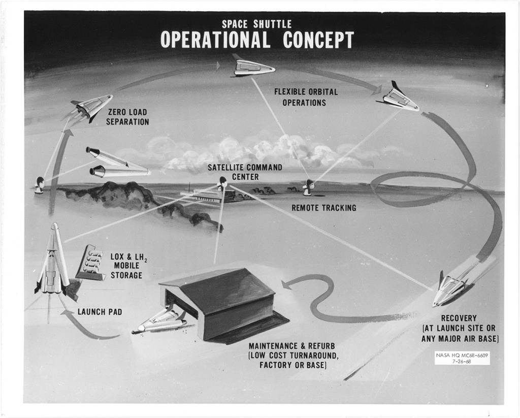 Artist’s concept of the pre-Shuttle Lockheed-sponsored Star Clipper stage-and-one-half lifting body configuration ascending from a desert launching base – circa 1968.