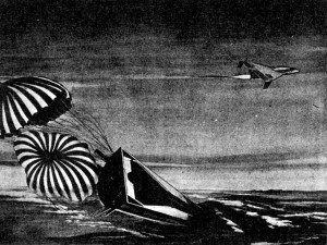The pod descends on parachutes and the crew flies to it’s preselected landing site.