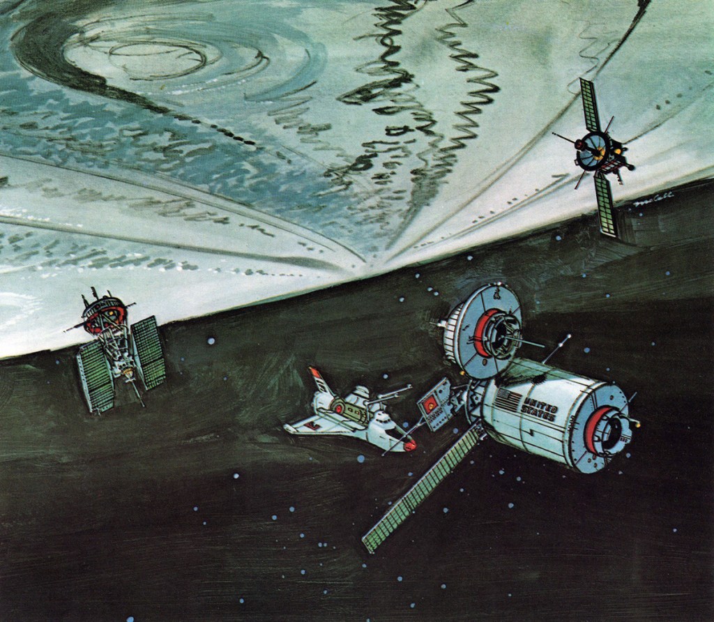 Another function of a future space station will be to service and inspect unmanned satellites. Here is an artist’s sketch showing an astronaut team, who travelled to their targets in a space ferry from an orbital station, working on various kinds of space probes.
