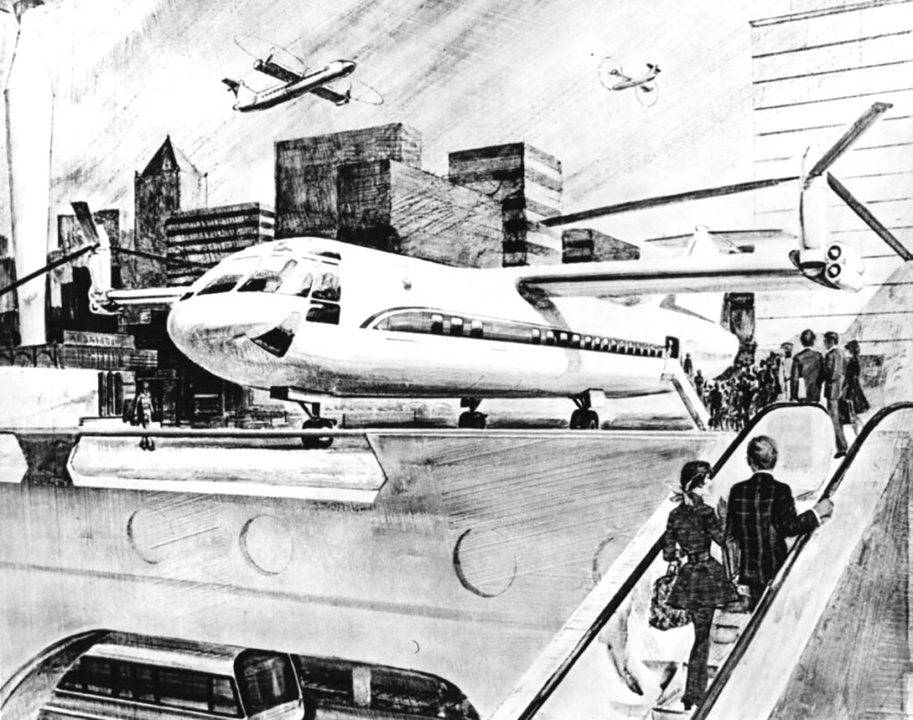INTERCITY AIR TRANSPORTATION: The aircraft depicted in this picture is an advanced rotorcraft which is capable of quiet vertical take-off and landing from cities close to or within urban centers. Its large rotors would provide efficient lift in vertical flight and when re-oriented would act as large propellers in horizontal flight. Other VTOL concepts, which utilize large fans in place of rotors are equally promising and may prove more efficient over longer routes. These VTOL aircraft could provide both intraurban and interurban passenger service and serve as versatile high speed links to major hub airports. The development of such VTOL aircraft will require improvements in fuel efficiency, operating cost, noise levels and ride quality over present vehicles. This will require advances in all the basic aeronautical disciplines including, for example aerodynamics, control systems, propulsion, structural design and the use of advanced materials.