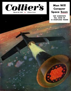 A spaceport and supply rocket designed by the Martin Marietta Corporation in mid-air in this scene from the Hall of Science space show. In such a port, astronauts may orbit for half a year.