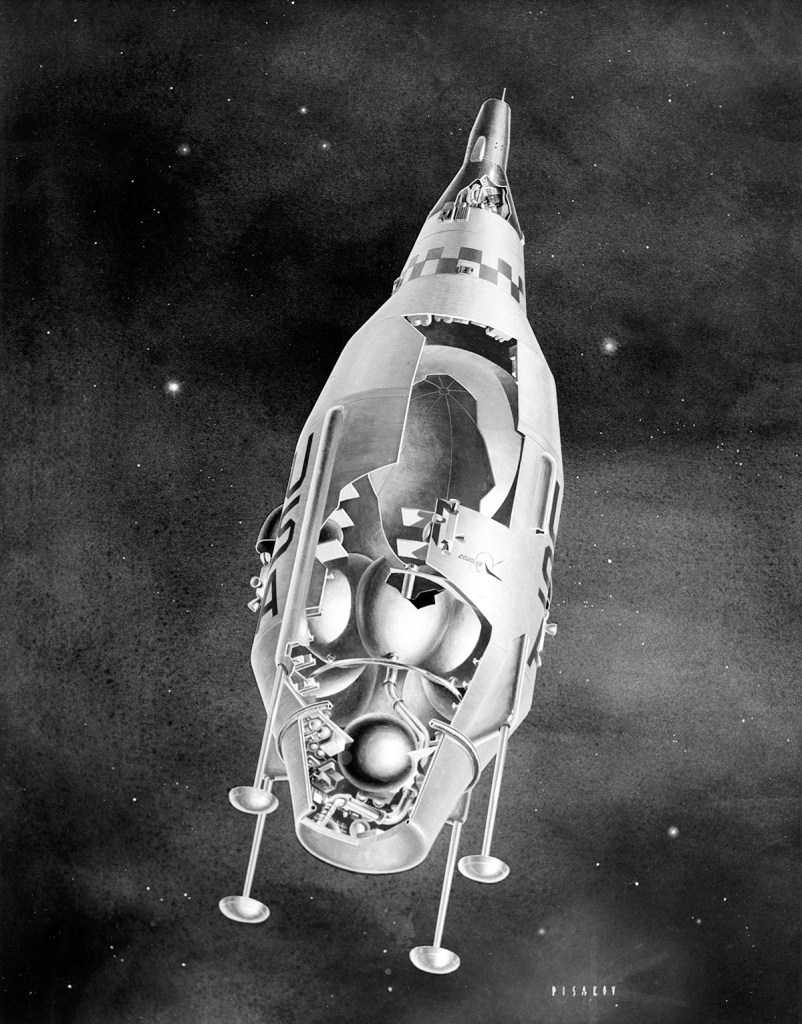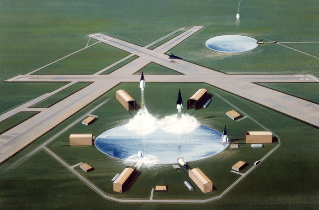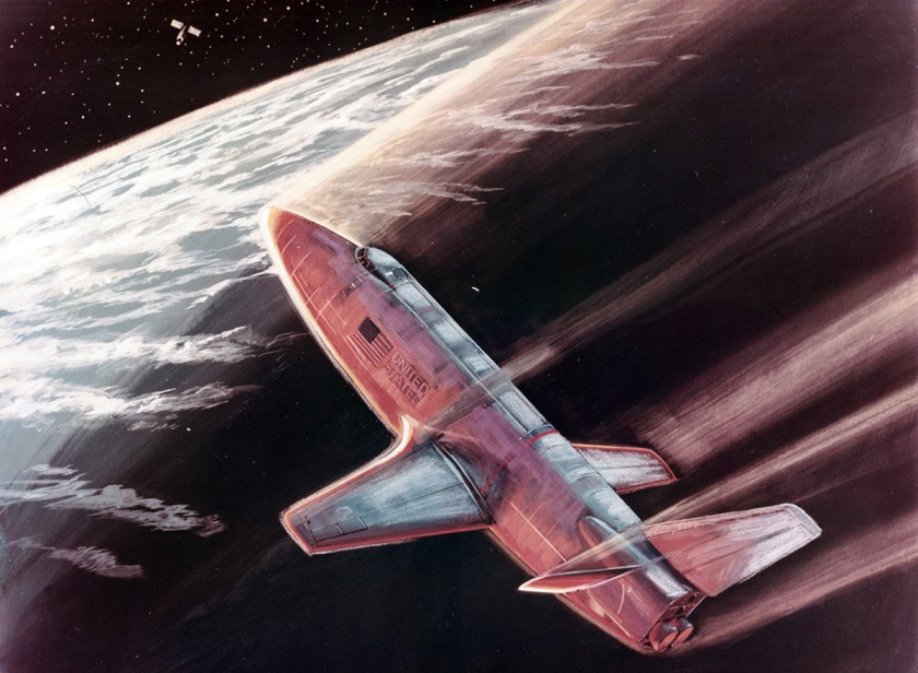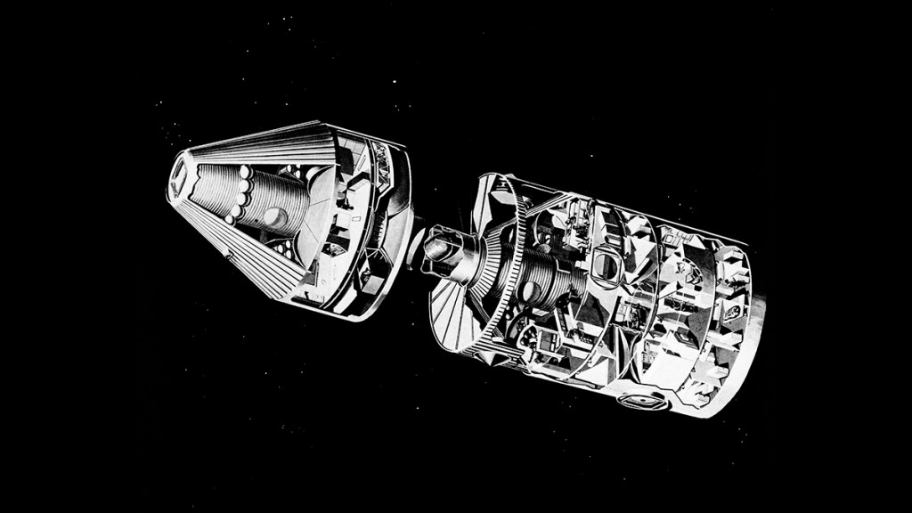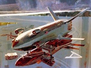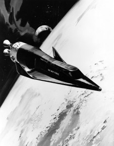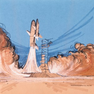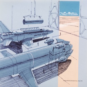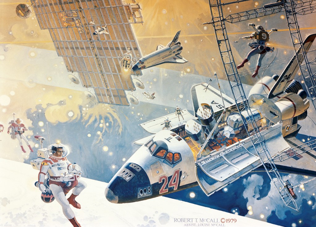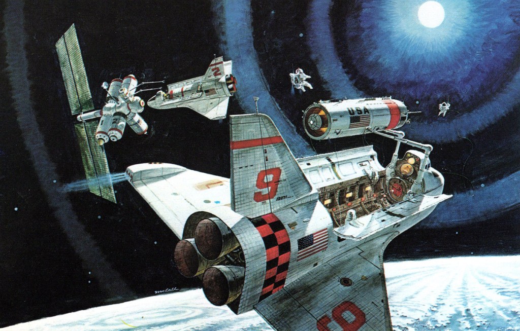Space shuttles at work. In the background, a space station cluster extends its manipulating arms to assist a shuttlecraft in docking.