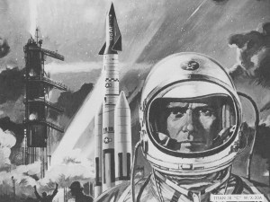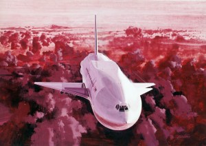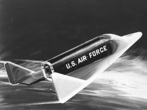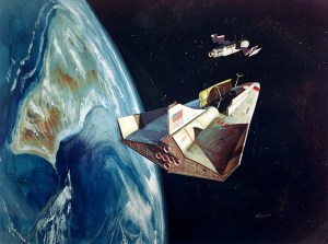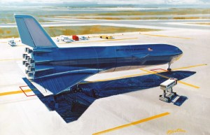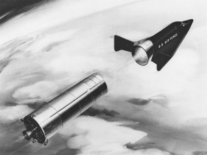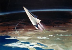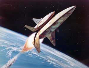 Concept shows the Shuttle in flight, heading toward separation of the Booster and the Orbiter at about 40-mi. altitude.