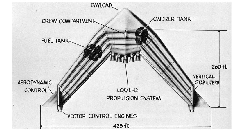 Still another possible space ferry of tomorrow is this huge Astroplane-10 liquid rocket system that can blast off from earth like a missile and later land like a regular airplane.